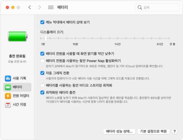 이 옵션을 사용하시면 사용하시는 응용 프로그램에 가장 적합한 그래픽 시스템으로 자동 전환되며, 이 옵션을 통해서 맥북의 배터리 사용 시간을 최대화할 수 있습니다.