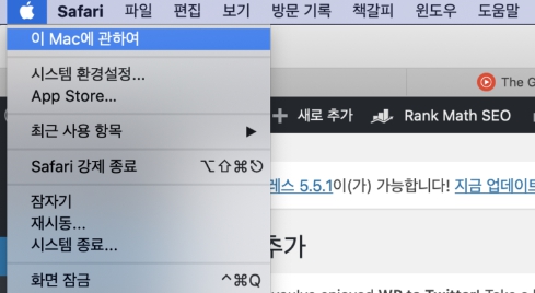화면 상단 왼쪽에 있는 애플의 상징! 사과 마크를 클릭하시면 위와 같은 항목이 표시됩니다. 이 중 [이 Mac에 관하여]를 클릭합니다.