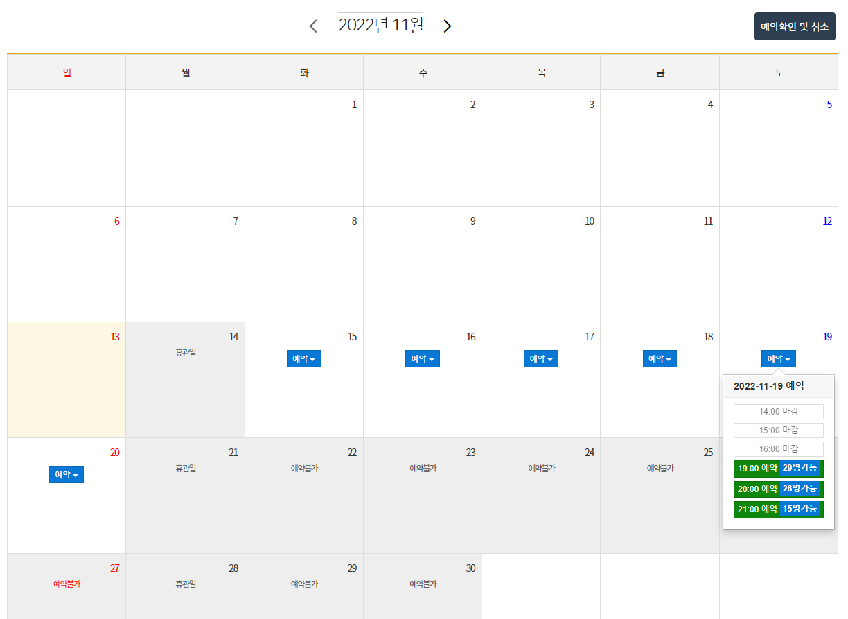 예약이 완료되면 위 그림처럼 예약을 진행한 대표자의 이름과 인원수, 신청 현황을 확인할 수 있습니다. 여기서 대표자의 이름이 보인다면 무사히 예약이 완료된 것입니다.