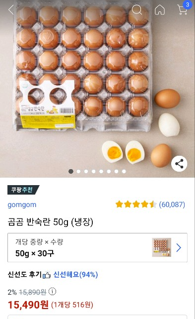 먼저 삶은 계란의 가격을 살펴보겠습니다. 쿠팡의 자체 브랜드인 곰곰 반숙란 30구의 가격은 15,490원입니다. 영양 성분을 살펴보도록 하겠습니다.
