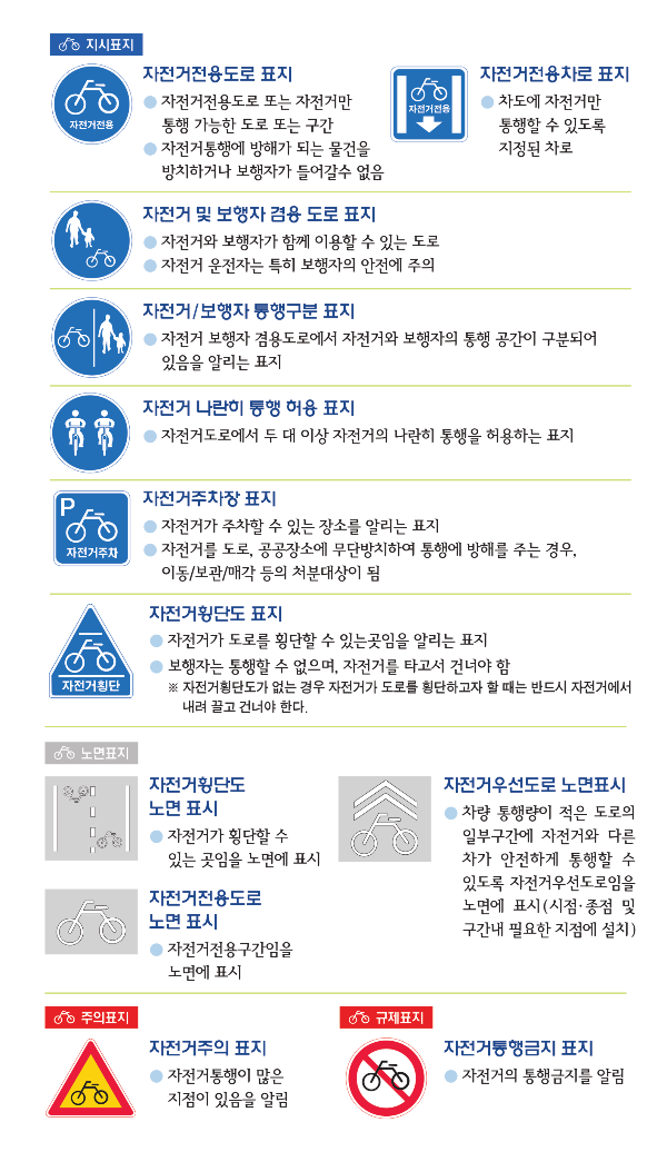 자전거 수신호는 도로교통법 제38조 1항에 의거하여 자동차 관련 수신호와 동일하다고 하니 운전자 여러분도 참고하시면 좋을 것 같습니다. 마지막으로 자전거와 관련된 안전 표기판 정보 안내드린 후 마치겠습니다.