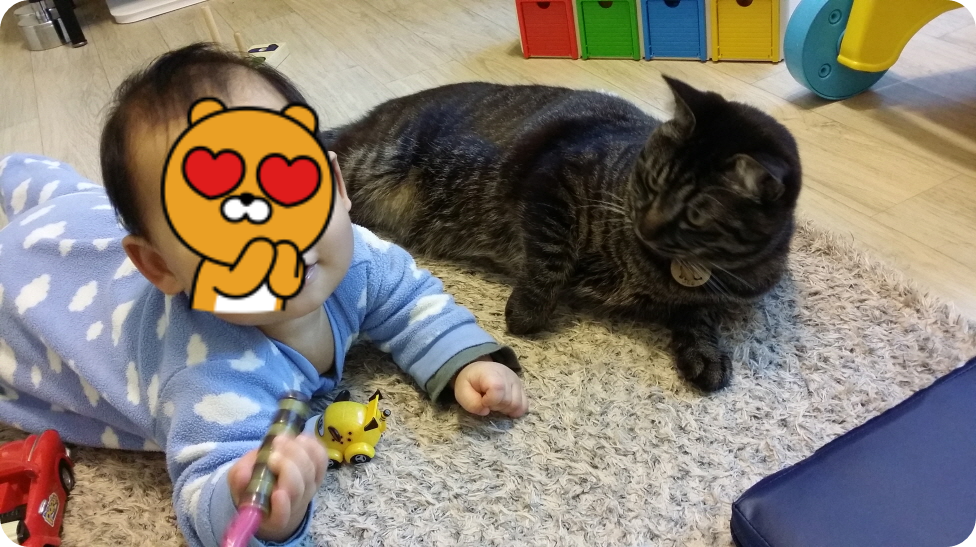 물론 아기가 처음 집에 온 날은 멀리서 바라보며 살짝 경계하기도 하였지만 금세 친구가 되었습니다. 아기를 유난히 좋아하는 고양이, 후추는 항상 아이의 곁에서 좋은 친구가 되어 주기도 하고 때로는 선생님이 되어주기도 하며 함께 자랐습니다.