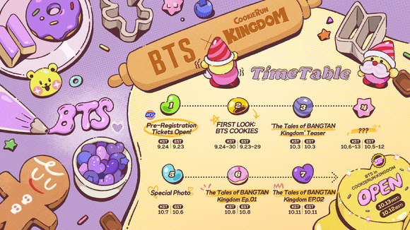 타임테이블에는 24일부터 시작되는 사전등록, 24일~30일까지 순차적으로 공개되는 BTS 쿠키, 10월 3일 3일 '더 테일즈 오브 방탄 킹덤' 티저 영상, 7일 스페셜 포토, 8일 '더 테일즈 오브 방탄 킹덤 Ep.01', 11일 '더 테일즈 오브 방탄 킹덤 Ep.02'이 진행되는 것을 확인할 수 있습니다.