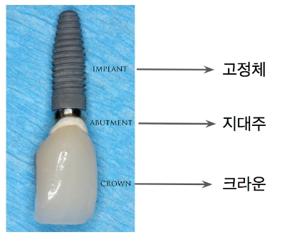 쉽게 이야기해서 고정체는 잇몸뼈 아래에서 “뿌리” 역할을 하여 이가 단단히 잇몸에 자리 잡게 하는 역할을 하고 크라운은 “인공치아”이며 지대주는 이 두 개의 구조물을 연결하는 “기둥" 역할을 하는 것입니다.